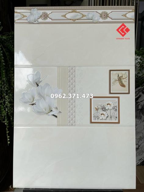 Gạch dán tường Ý Mỹ 30x60 đẹp tông màu kem nhạt. Viên điểm nhấn bông hoa ở giữa tạo sự hài hòa kết hợp với viên gạch. Làm cho khu vực có sự nhấn nhá, sắc nét, tạo điểm riêng biệt.