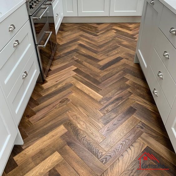 Đây là một trong những kiểu lát gạch theo kiểu Tây Âu, bạn có thể phối thêm một số loại gạch trang trí theo phong cách hiện đại kết hợp với gạch giả gỗ.